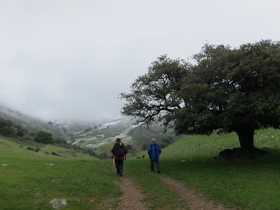 No llueve, que no es poco, hemos dejado el coche  a pocos metros del cortijo y nos acercamos a él por la pista, no hay nadie, solo un perro se acerca a ladrarnos, como es su deber. Abrimos la cancela que hay entre las dos edificaciones y seguimos por la pista que se eleva hacia la sierra.